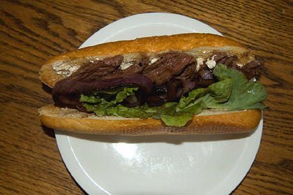 Speaking of eating sandwiches, while the grains were mashing (sitting in the oven for an hour, steeping at 156 deg. Fahrenheit), Malin made delicious steak sandwiches for lunch. She cooked up skirt steak to medium rare, caramelized some red onions, and pulled some fresh greens from the garden. This was all added to a Publix bakery hoagie (they make pretty damn good bread there) with some spicy brown mustard and some pepper-crusted goat cheese (Ile de Franc Petit Bûche). I opted for provolone instead of goat cheese and also tossed in a little creamy horseradish spread.